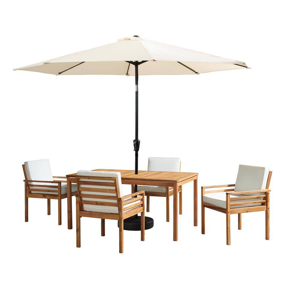 Alaterre Furniture 6 -Piece Set, Okemo Wood Outdoor Dining Table Set with 4 Cushioned Chairs, 10 ft. Auto Tilt Umbrella Tan