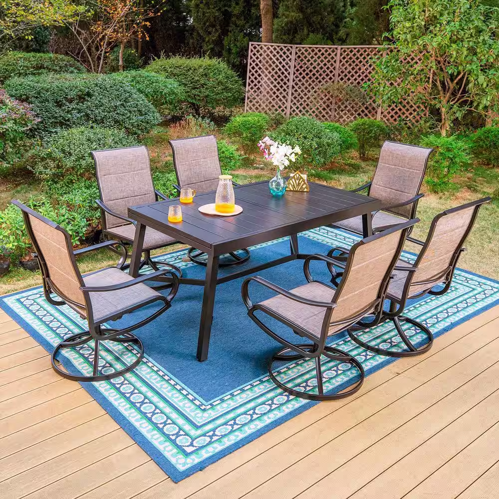 None Black 7-Piece Metal Outdoor Patio Dining Set with Slat Extendable Table and High Back Padded Textilene Swivel Chairs
