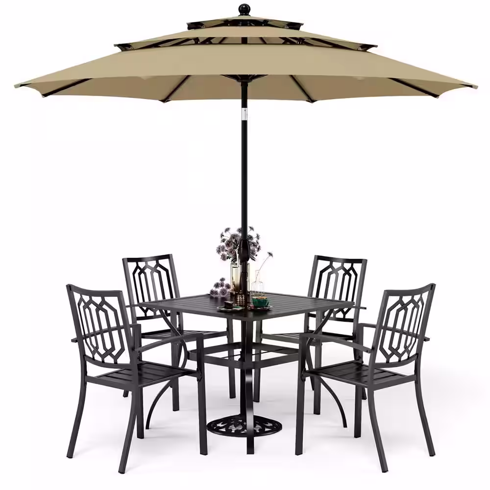 None Black 6-Piece Metal Square Patio Outdoor Dining Set with Slat Table, Umbrella and Fashion Stackable Chairs
