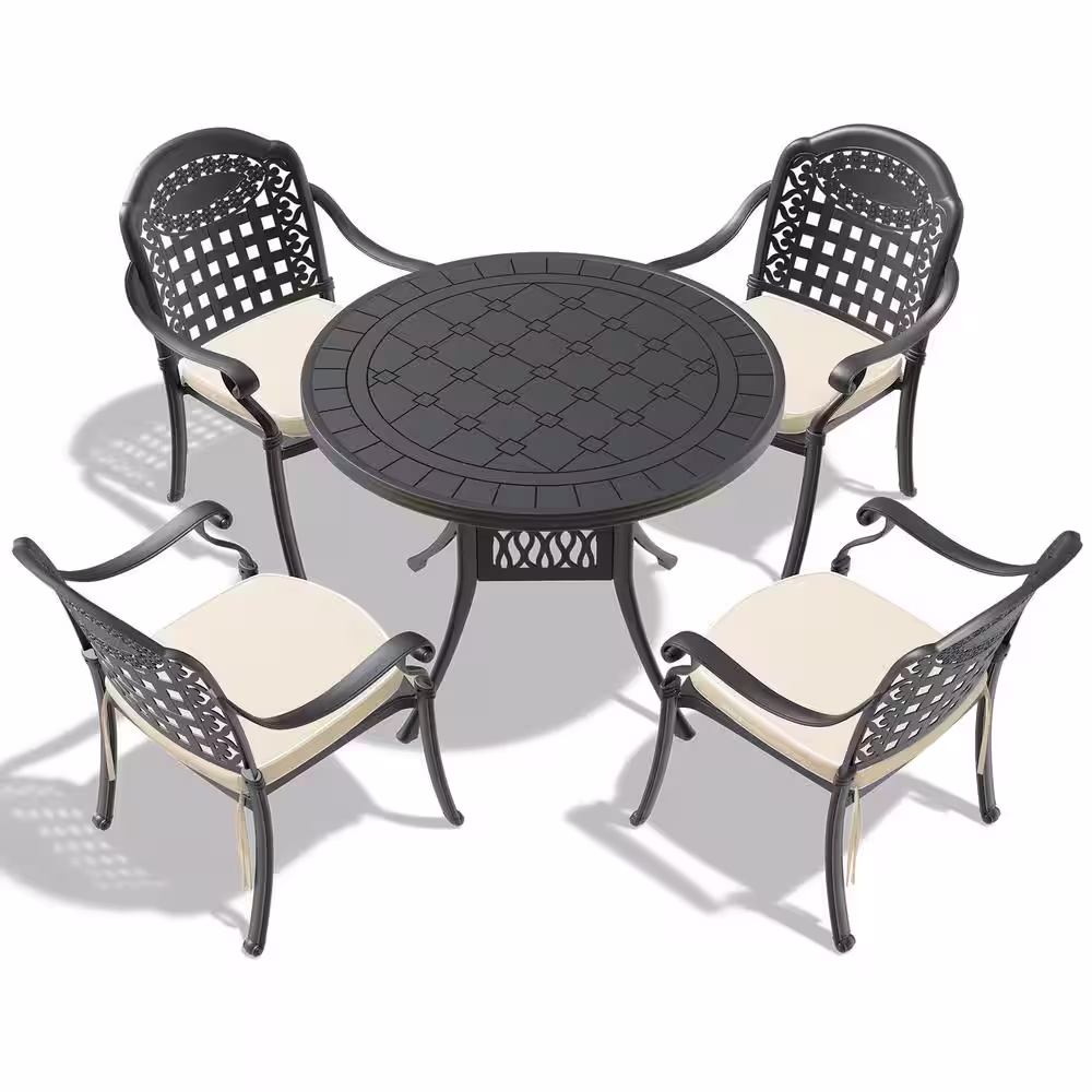 None Isabella Black 5-Piece Cast Aluminum Outdoor Dining Set with 39.37 in. Round Table and Random Color Seat Cushions