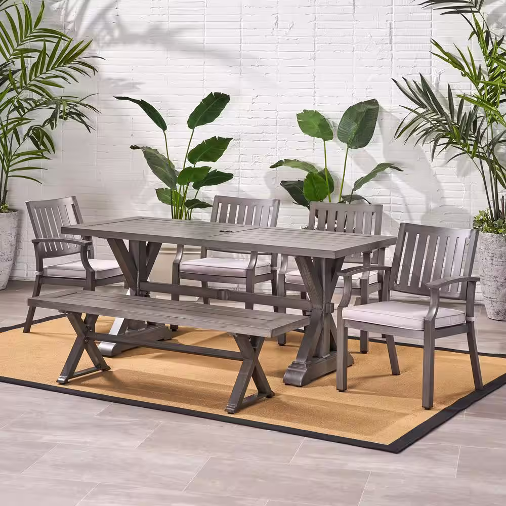 Noble House Lombok 29.50 in. Dark Grey 6-Piece Aluminum Rectangular Outdoor Dining Set with Silver Cushions