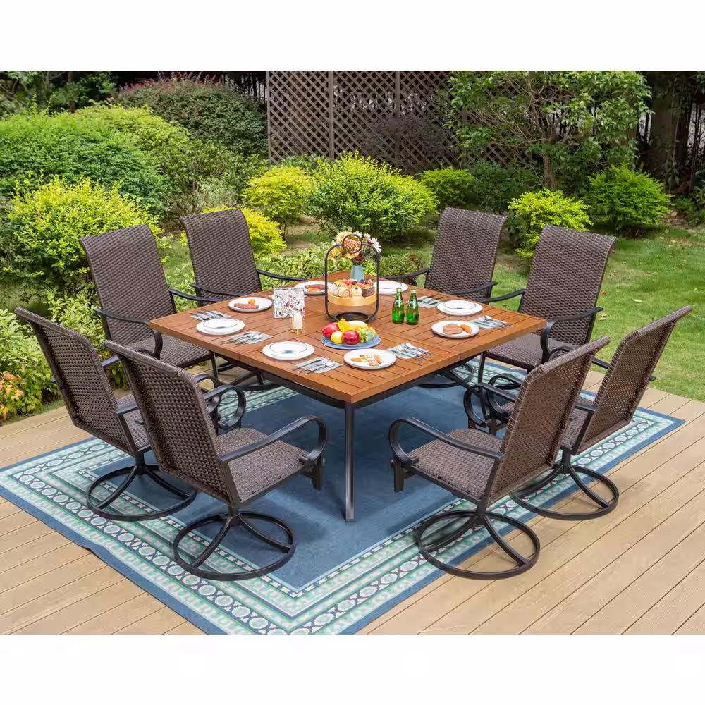 None 9-Piece Metal Patio Outdoor Dining Set with Square Brown Table and High-Back Swivel Rattan Chairs