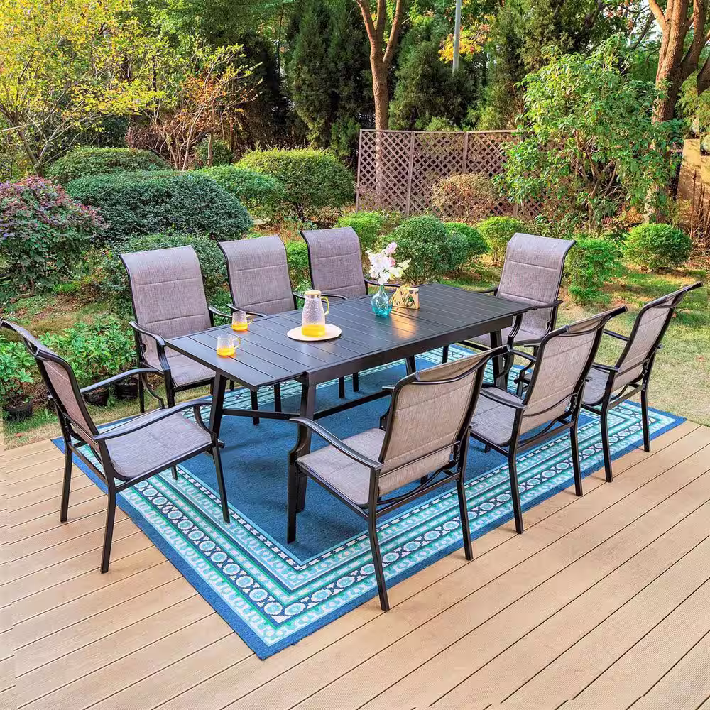 None Black 9-Piece Metal Outdoor Patio Dining Set with Slat Extendable Table and High Back Padded Textilene Chairs
