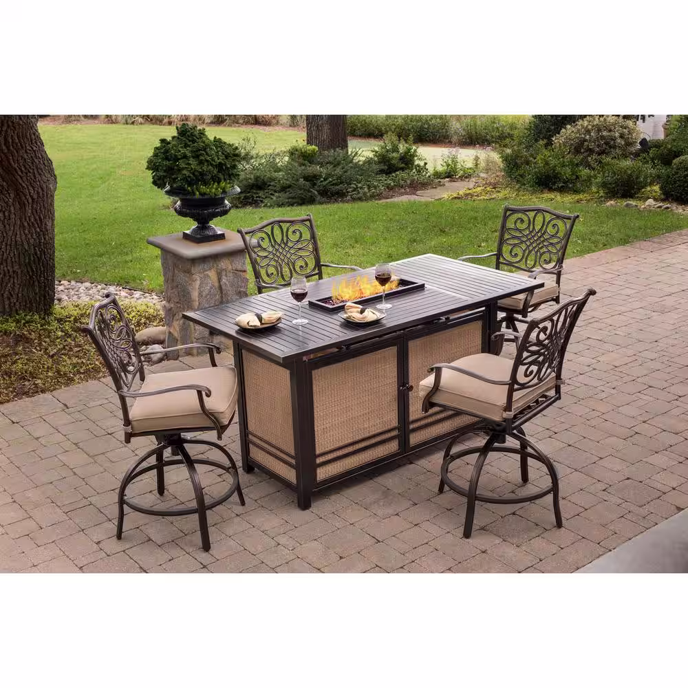 Hanover Traditions 5-Piece Aluminum Rectangular Outdoor High Dining Set with Fire Pit with Natural Oat Cushions