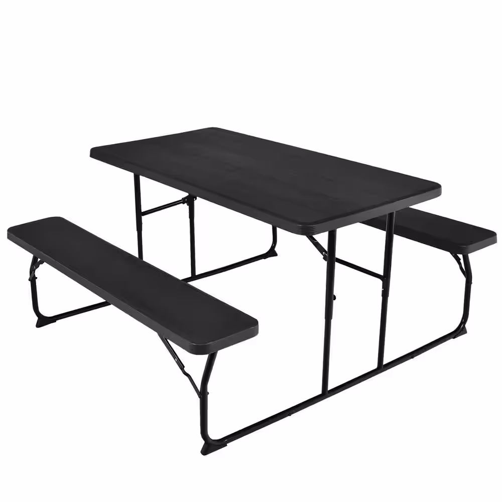 None 54 in. Black Rectangle Folding Picnic Table and Bench Set for Camping BBQ w/Steel Frame