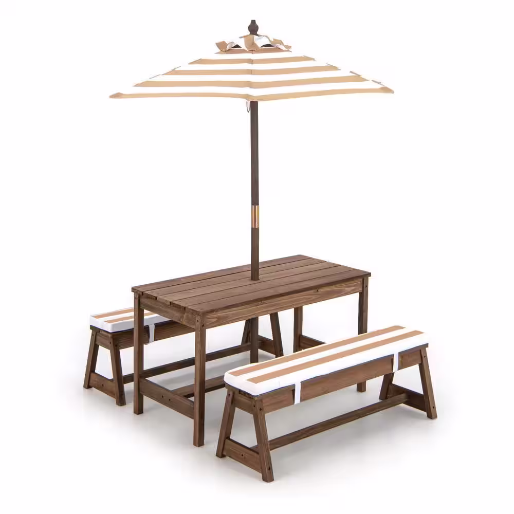 ANGELES HOME 35 in. Brown Rectangle Fir Wood Kids Picnic Table and Chairs with Cushions and Height Adjustable Umbrella