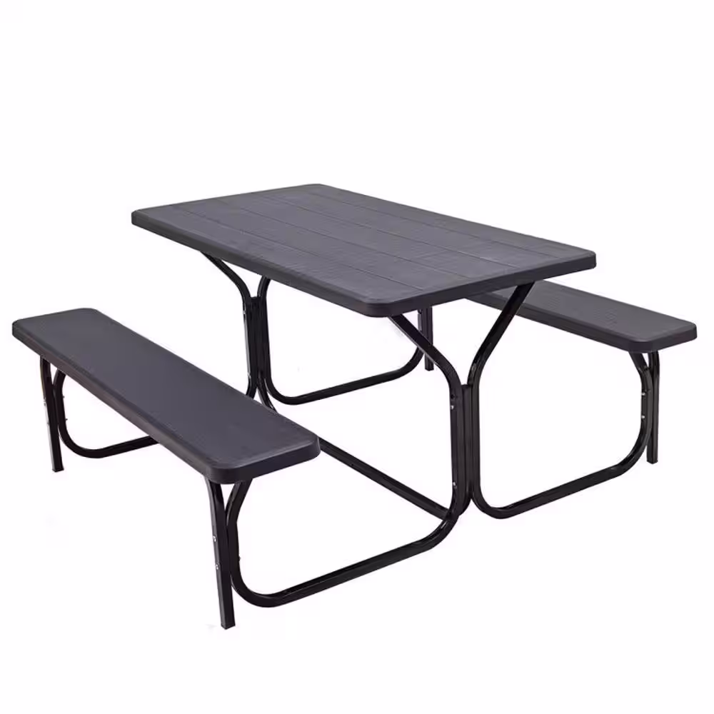 Cesicia 54 in. W Black Rectangle High-Density Polyethylene All Weather Outdoor Picnic Table Bench Set with Metal Base Wood