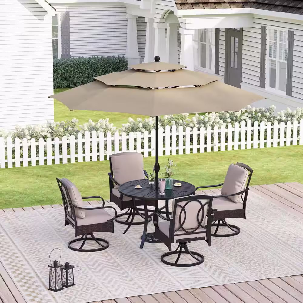 PHI VILLA 6-Piece Metal Patio Outdoor Dining Set with Beige Cushions with 4 Swivel Dining Chairs and Beige Umbrella