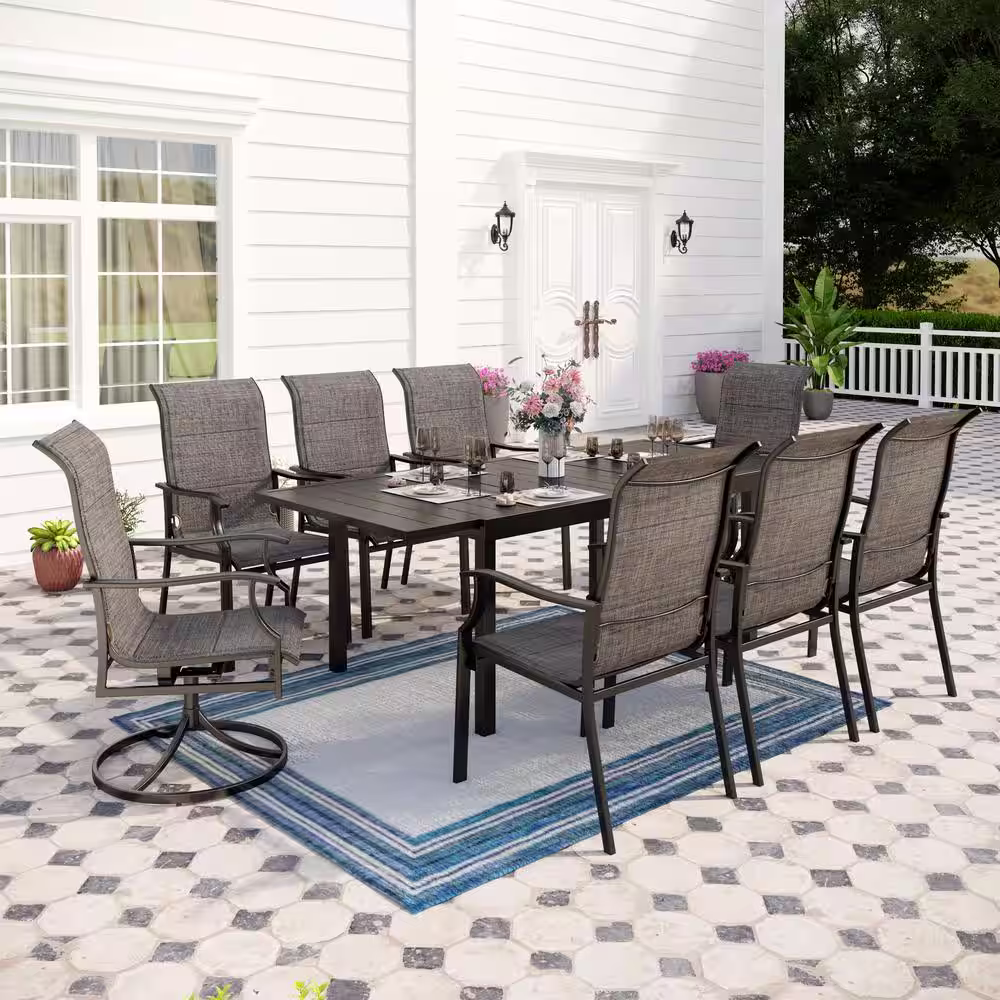 None Black 9-Piece Metal Outdoor Dining Set with Padded Swivel Rocker Texitilene Chair and Expandable Table