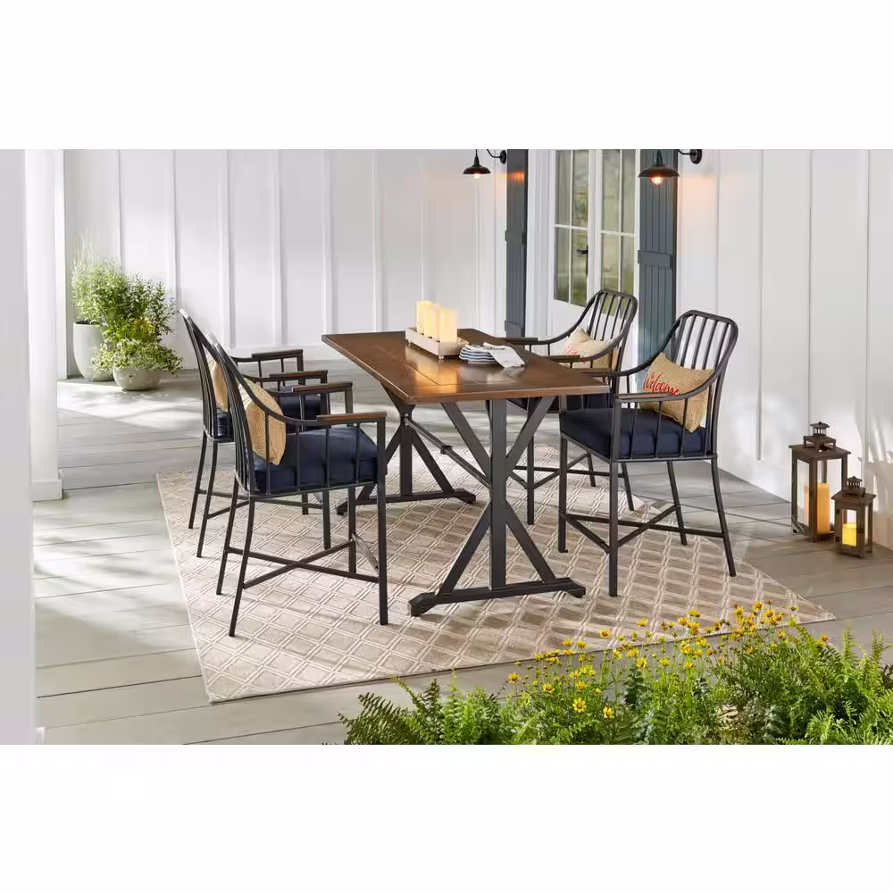 StyleWell Bedford Farmhouse 5-Piece Steel Rectangle Balcony Height Outdoor Patio Dining Set with Blue Cushions