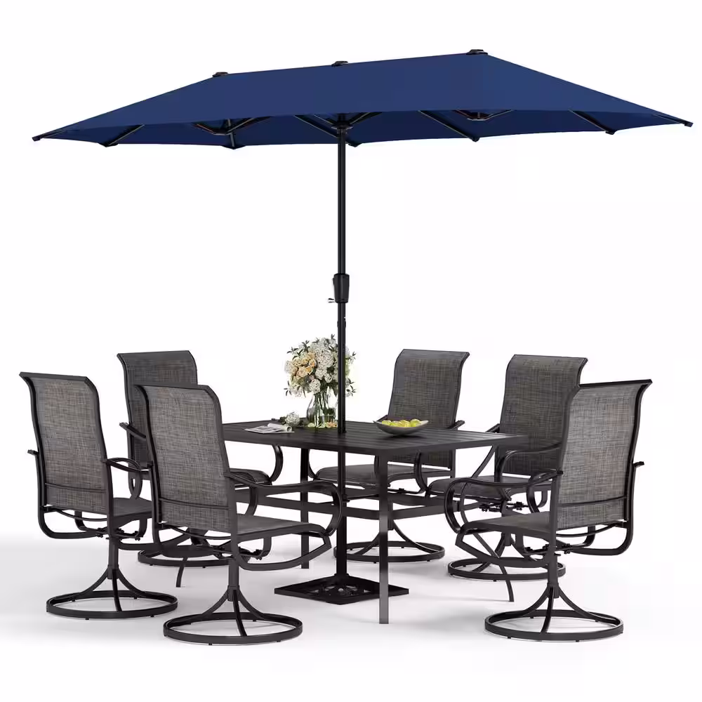 None Black 8-Piece Metal Rectangle Patio Outdoor Dining Set with Slat Table, Umbrella and Textilene Swivel Chairs