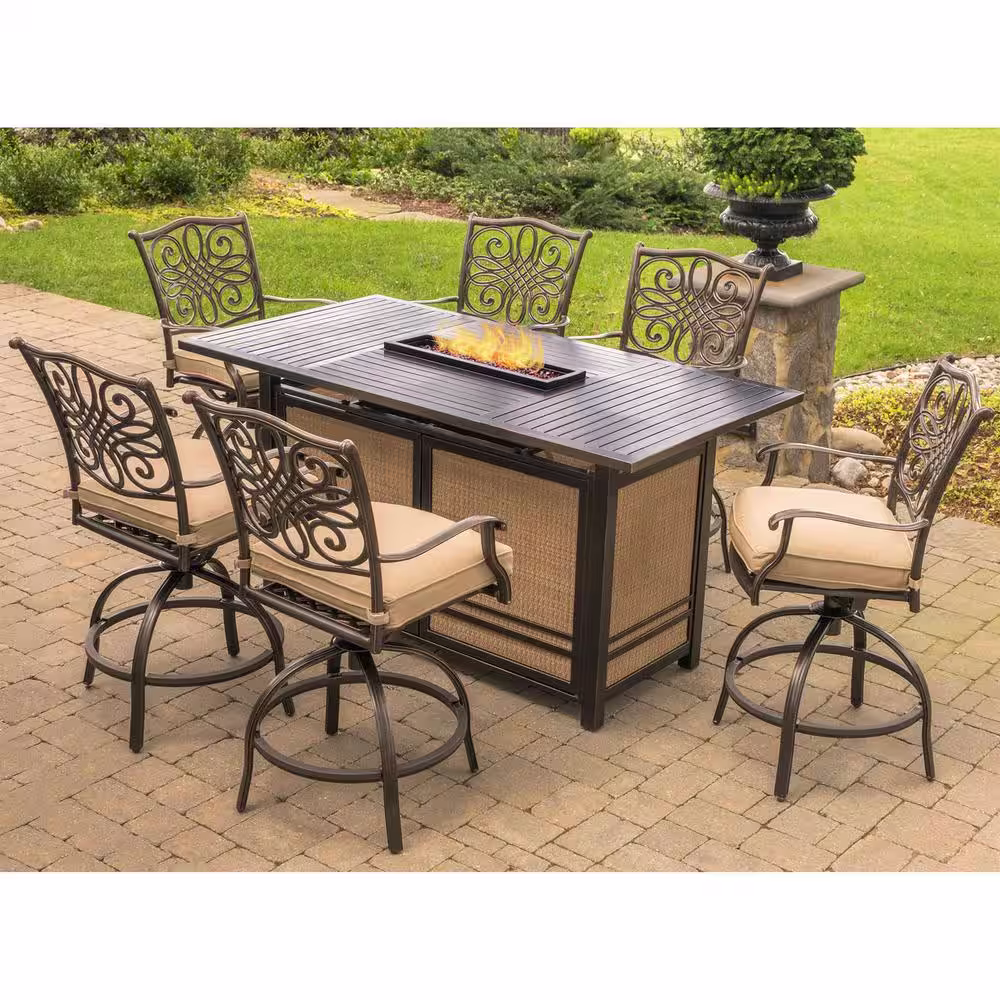 Hanover Traditions 7-Piece Aluminum Rectangular Outdoor High Dining Set with Fire Pit with Natural Oat Cushions