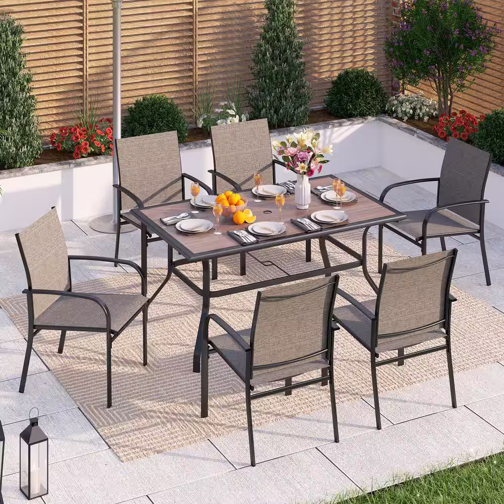 None Black 7-Piece Metal Outdoor Patio Dining Set with Wood-Look Umbrella Table and Brown Textilene Chairs