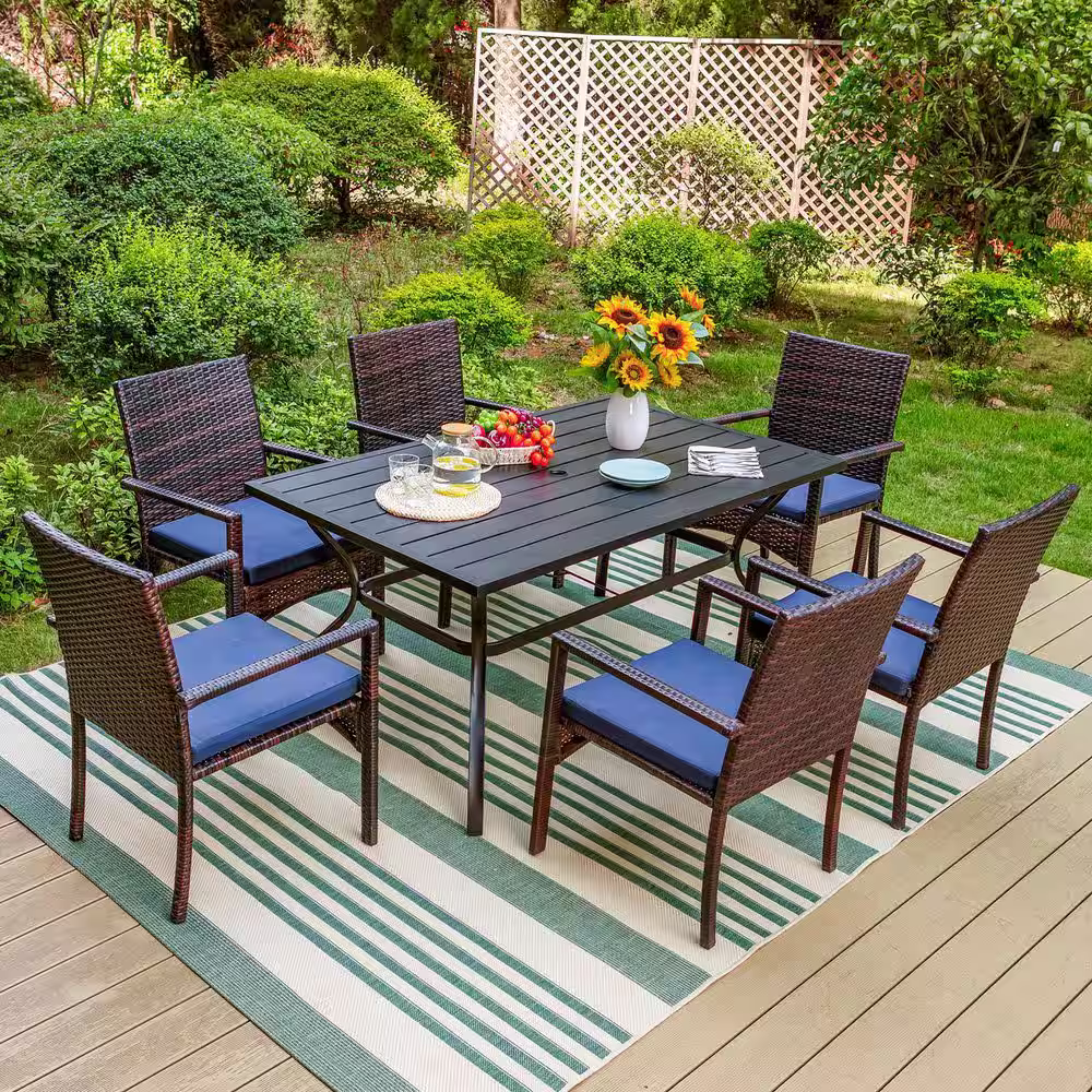 None 7-Piece Metal Patio Outdoor Dining Set with Rectangle Slat Table and Rattan Chair with Blue Cushion