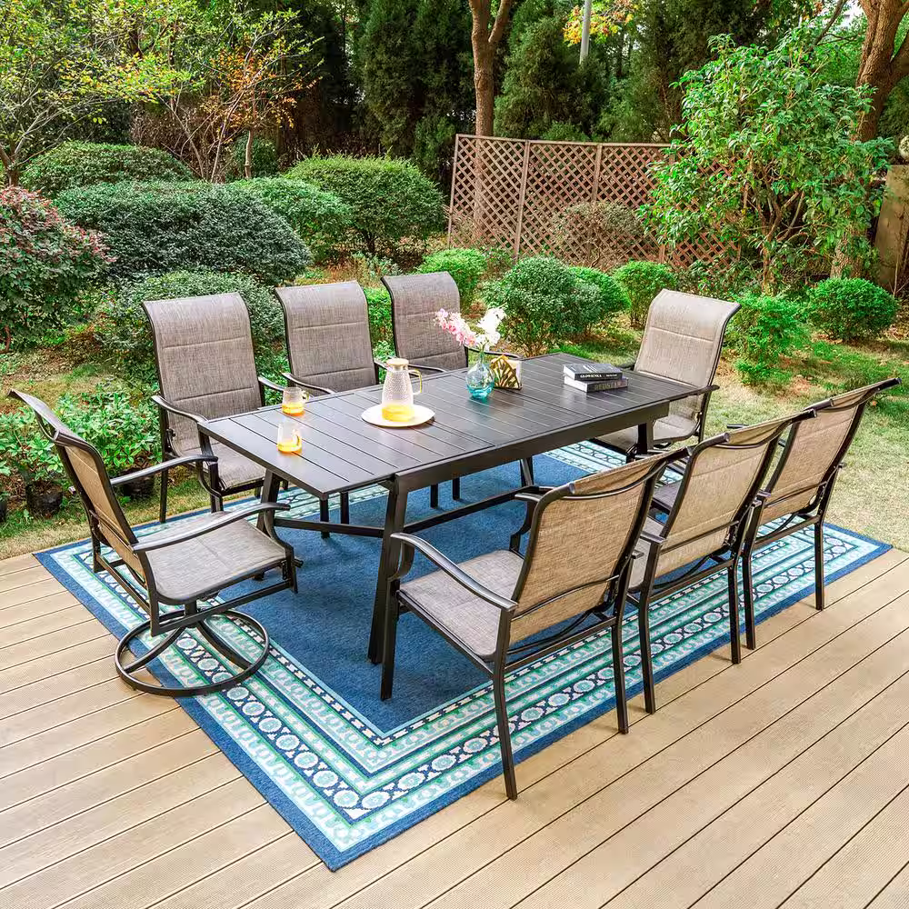 None 9-Piece Metal Patio Outdoor Dining Set Extendable Rectangle Table and Padded Textilene Chairs