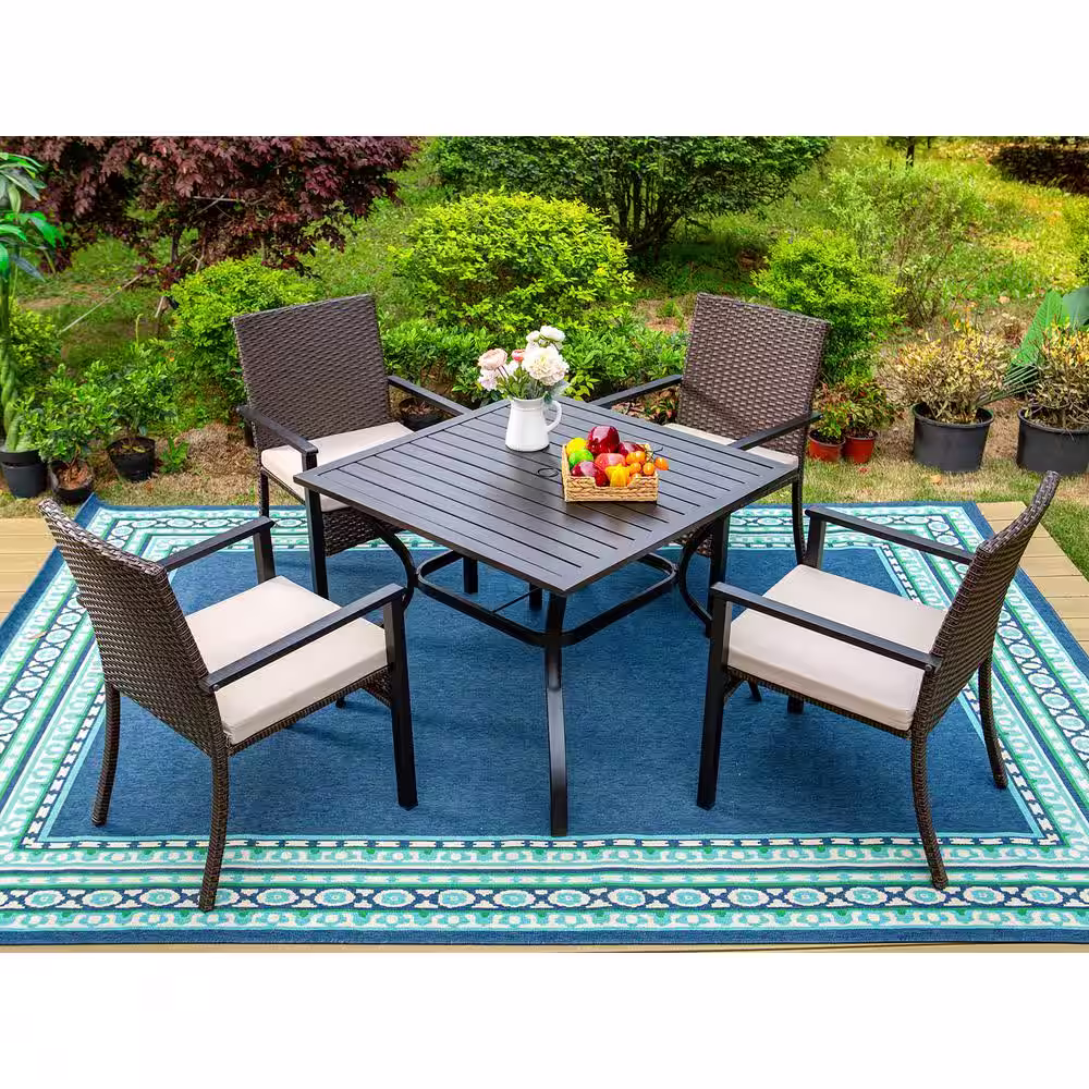 None Black 5-Piece Metal Slat Square Table Patio Outdoor Dining Set with Rattan Chairs with Beige Cushion