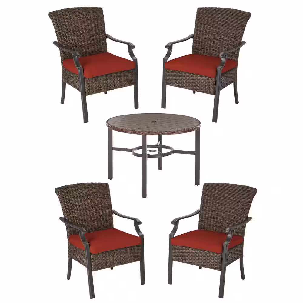 Hampton Bay Harper Creek 5-Piece Brown Steel Outdoor Patio Dining Set with CushionGuard Quarry Red Cushions