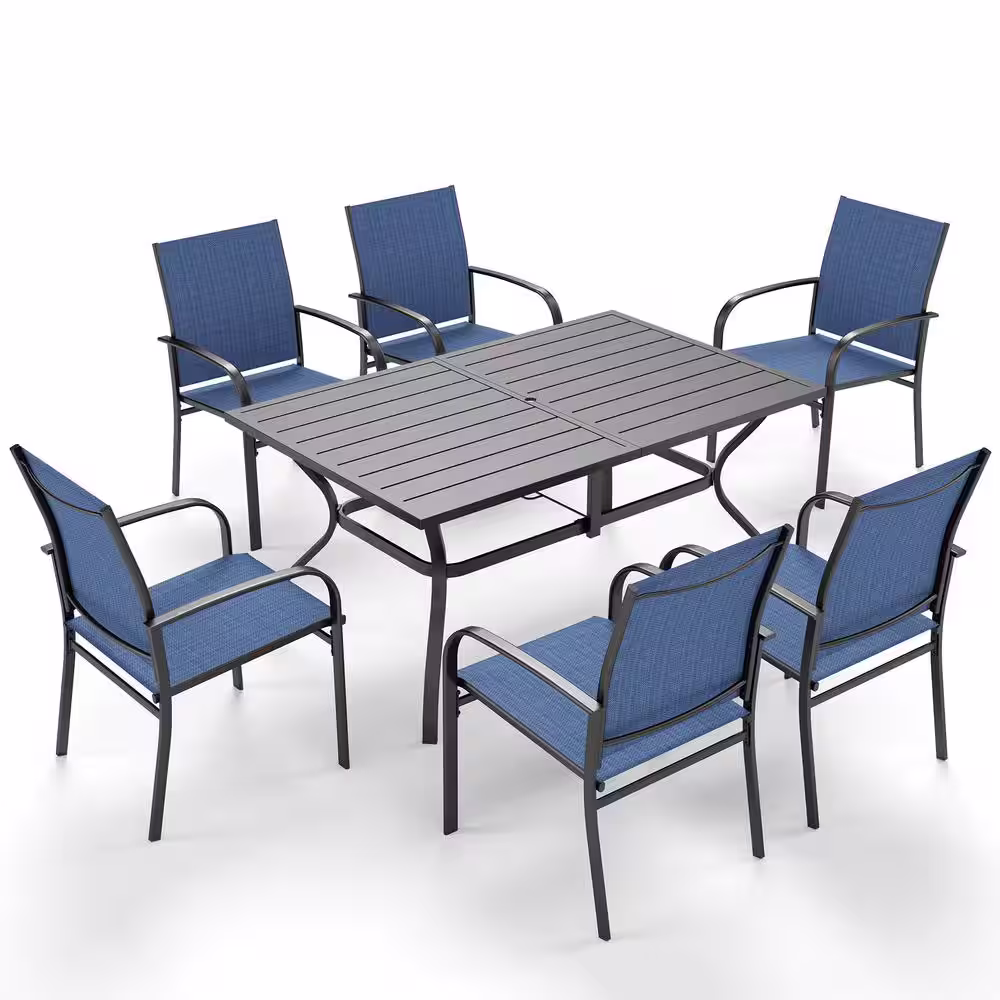 None Black 7-Piece Metal Slat Rectangle Table Outdoor Patio Dining Set with Blue Textilene Chairs