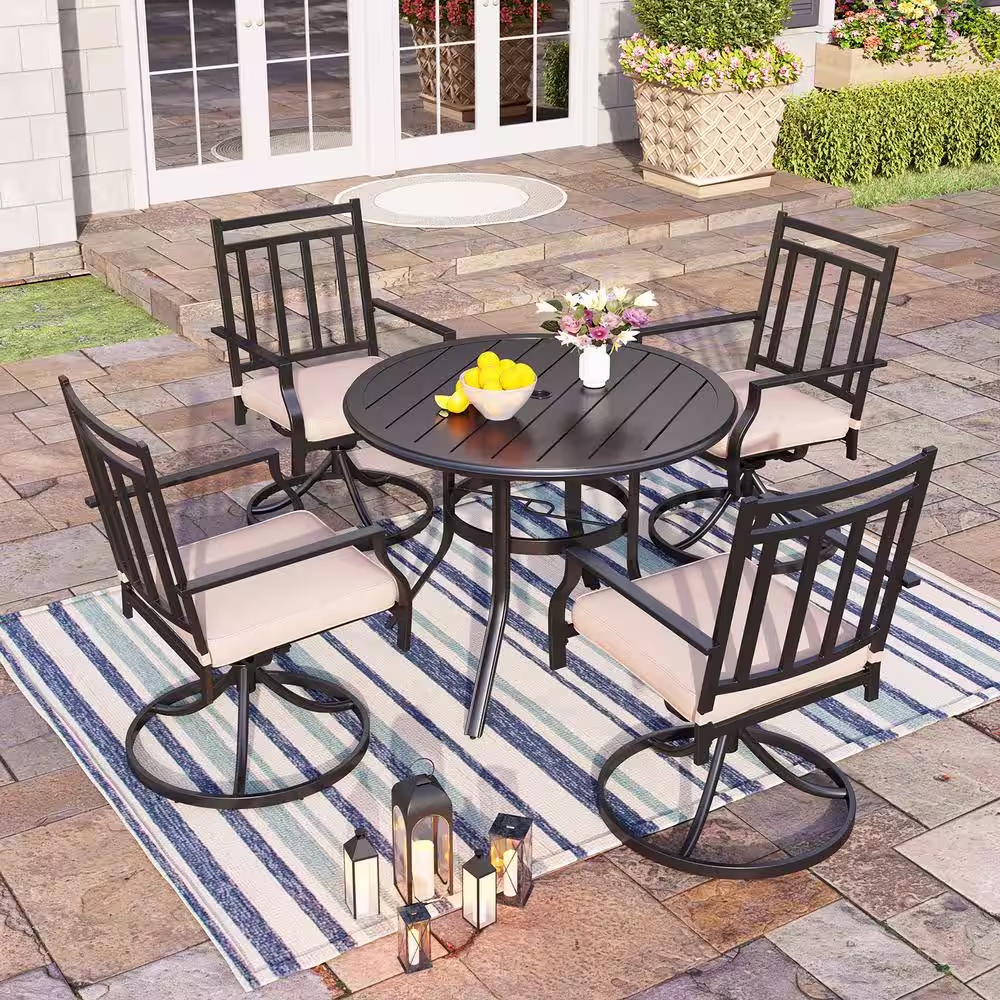 None Black 5-Piece Metal Round Table Patio Outdoor Dining Set with Slat Swivel Chairs with Beige Cushions