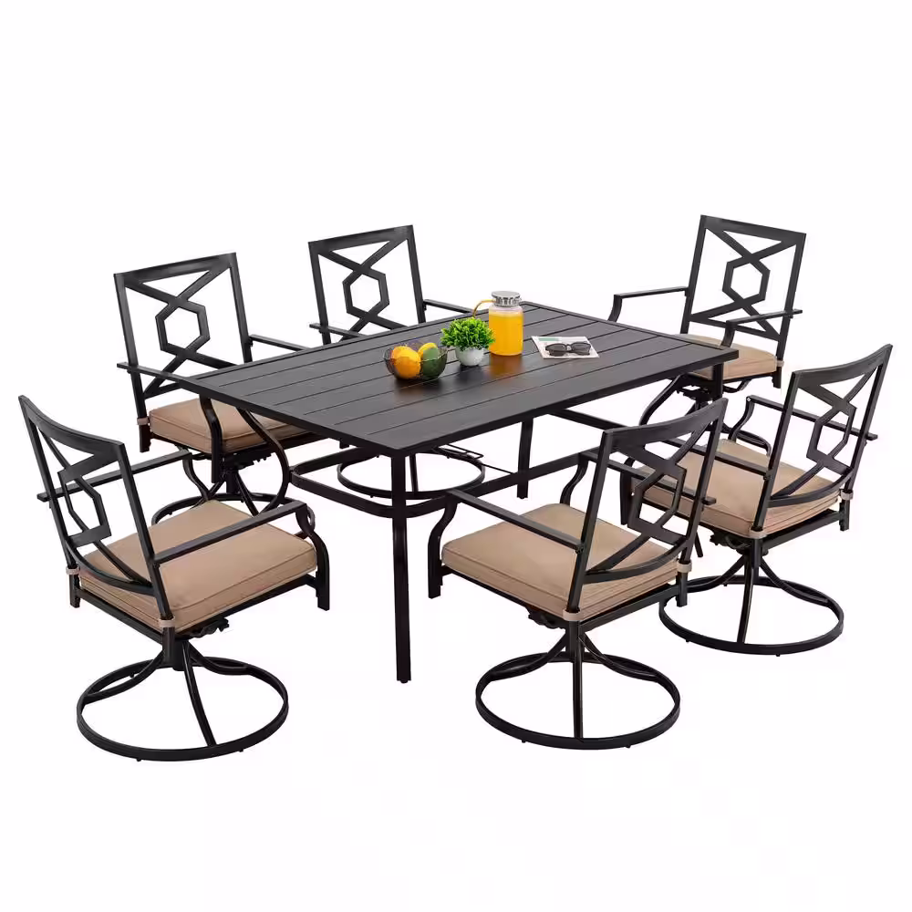 Nuu Garden Black 7-Piece Metal Rectangle Patio Outdoor Dining Set with Beige Cushions Outdoor Table Set and Swivel Chairs