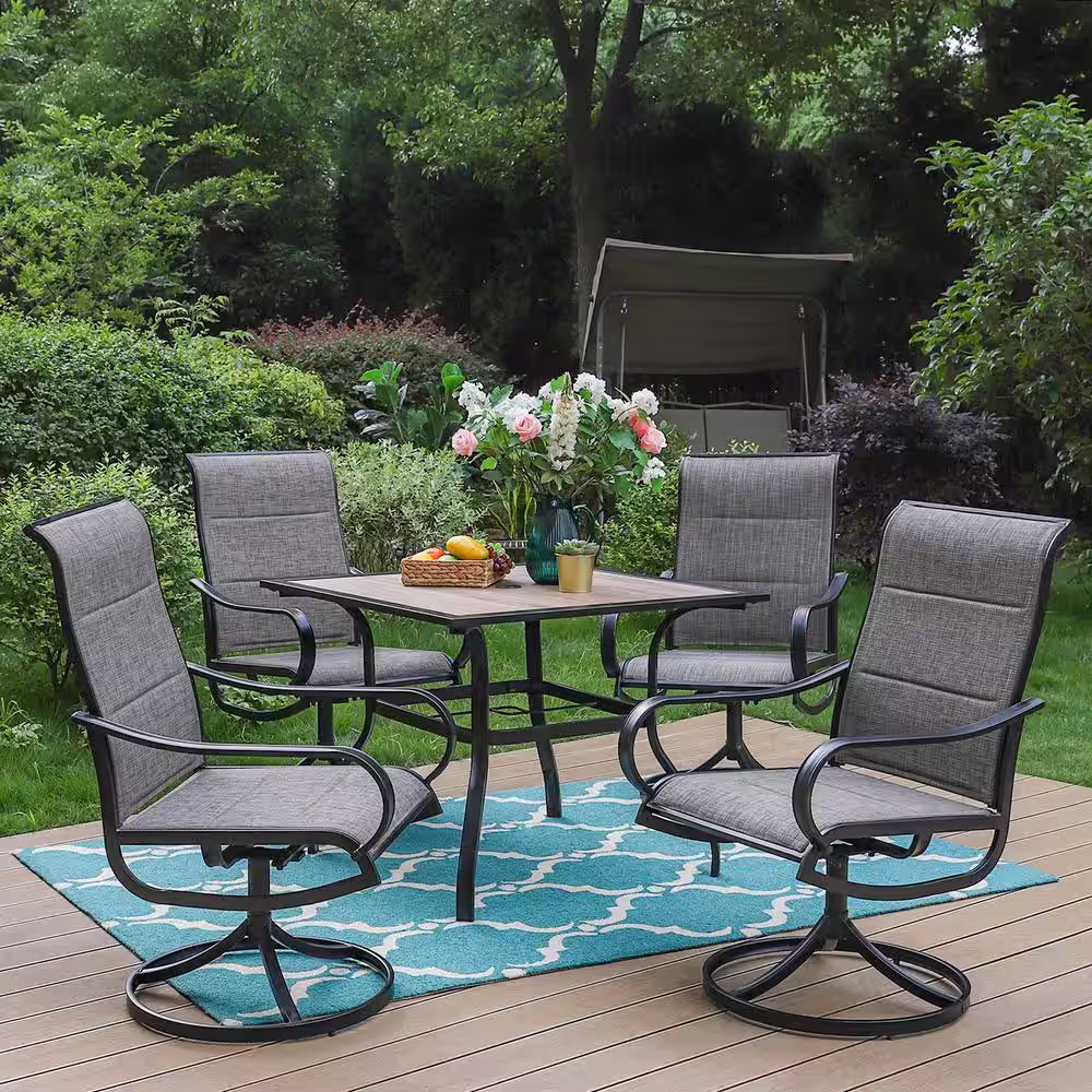 PHI VILLA Black 5-Piece Metal Outdoor Patio Dining Set with Wood-Look Square Table and Padded Textilene Swivel Chairs
