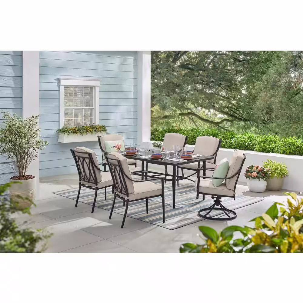 Hampton Bay Tully Park 7-Piece Metal Rectangle Outdoor Dining Set with CushionGuard Putty Tan Cushions