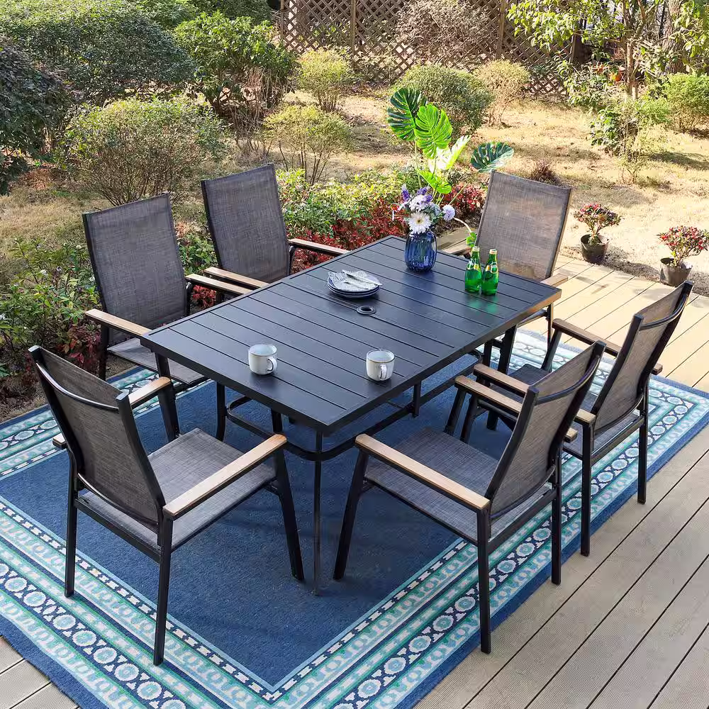None Black 7-Piece Metal Outdoor Patio Dining Set with Rectangle Table and Stackable Aluminum Chairs