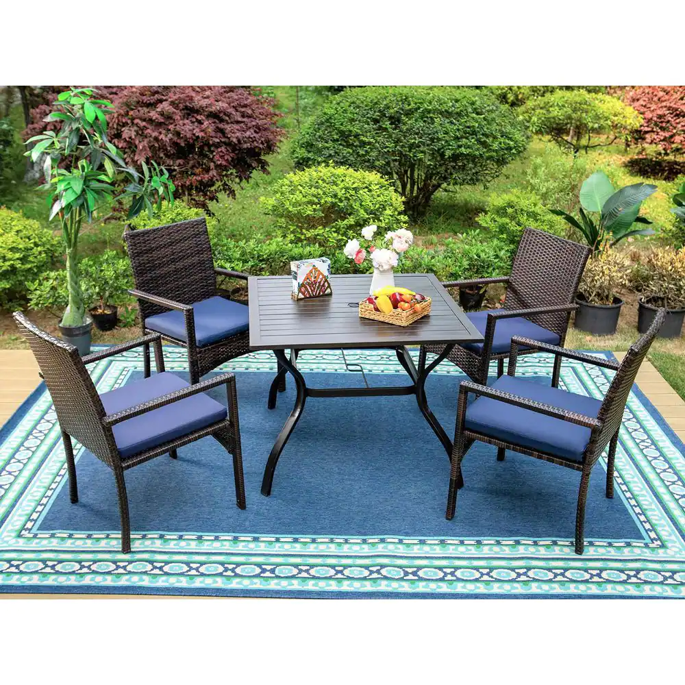 None 5-Piece Metal Patio Outdoor Dining Set with Square Table and Rattan Chair with Blue Cushion