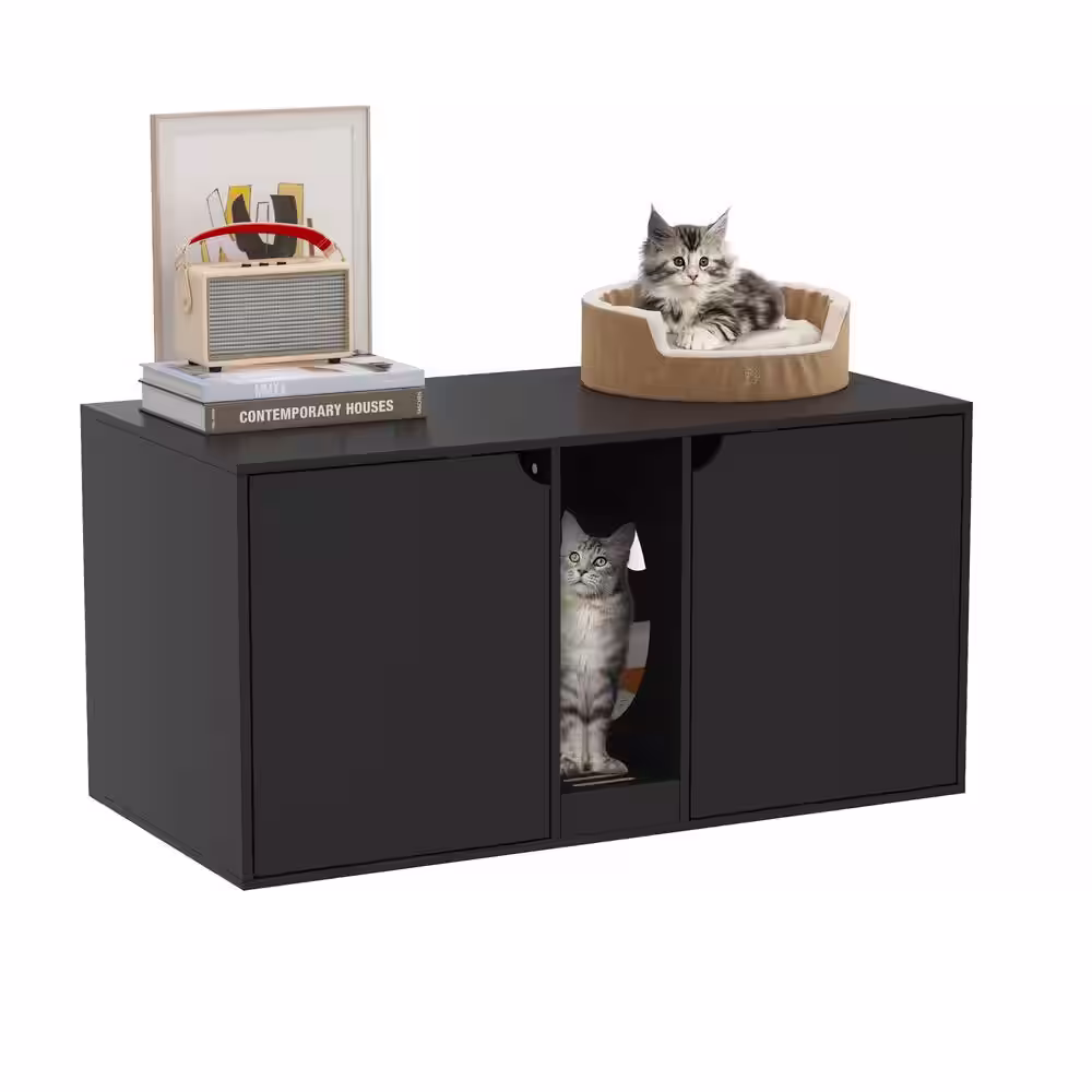 None Large Cat Litter Box Enclosure for 2 Cats, Indoor Wood Stackable Cat Washroom Cabinet Bench End Table Furniture, Black