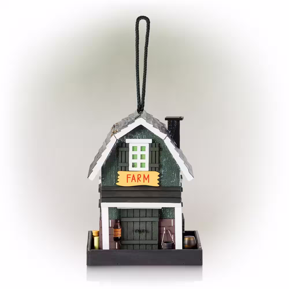 Alpine Corporation 9 in. Tall Wooden Farm Store Hanging or Table Outdoor Bird Feeder House, Black