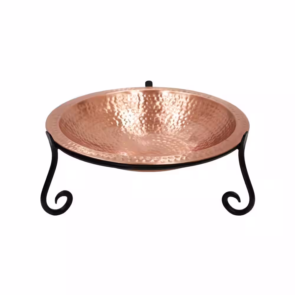 ACHLA DESIGNS 14 in. W Round Satin Hammered Solid Copper Birdbath Bowl w/ Blk Wrought Iron Short Stand Garden Accent Outdoor Accessory