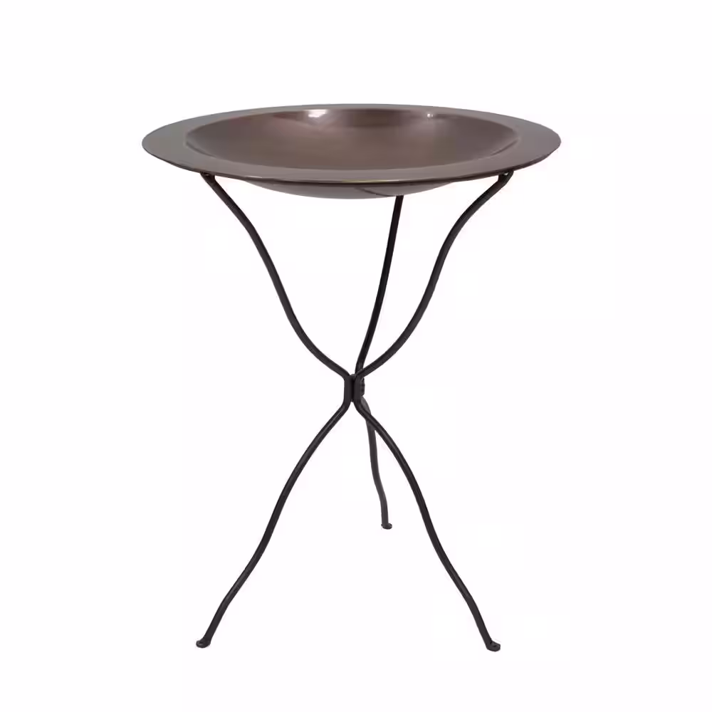 ACHLA DESIGNS 24 in. Dia Round Antique Finished Brass Classic Copper Birdbath with Black Wrought Iron Folding Ring Stand