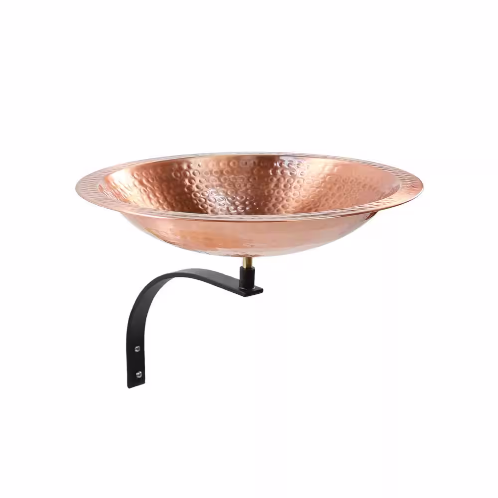 ACHLA DESIGNS 16 in. W Round Satin Hammered Solid Copper Birdbath Bowl with Black Wrought Iron Wall Mount Bracket