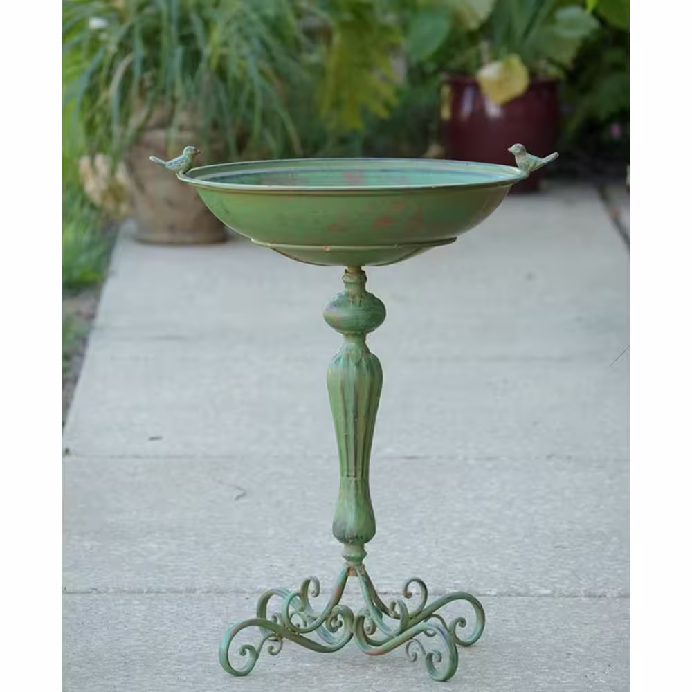 Zaer Ltd. International Iron Pedestal Birdbath with Little Bird Detail in Antique Green