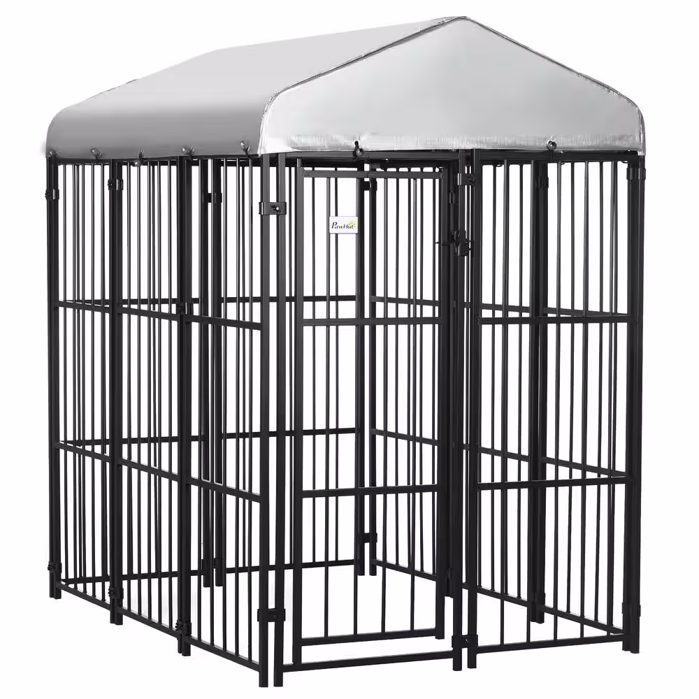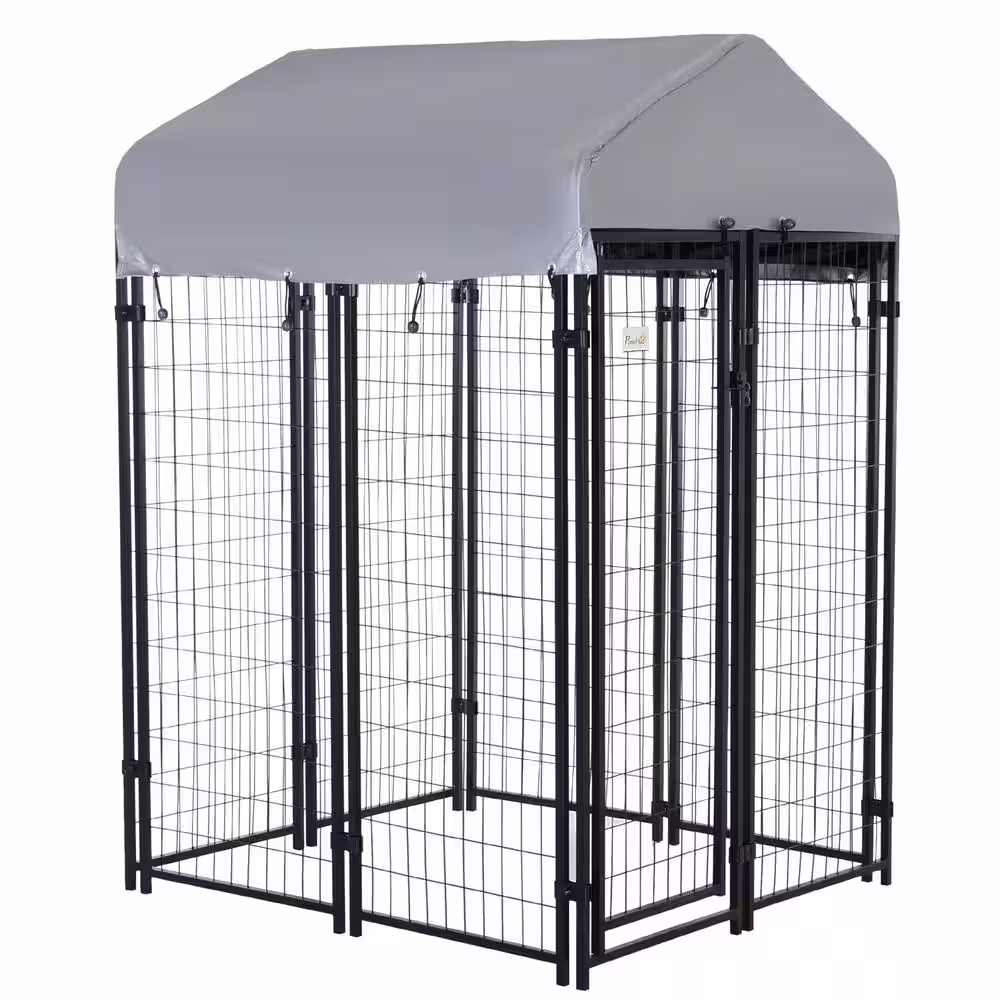 PawHut 4 ft. x 4 ft. x 6 ft. 0.0004-Acre Black Steel In-Ground Dog Fence Dog Kennel Outdoor Steel Fence with Canopy