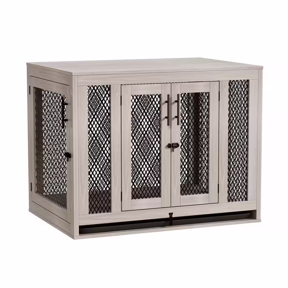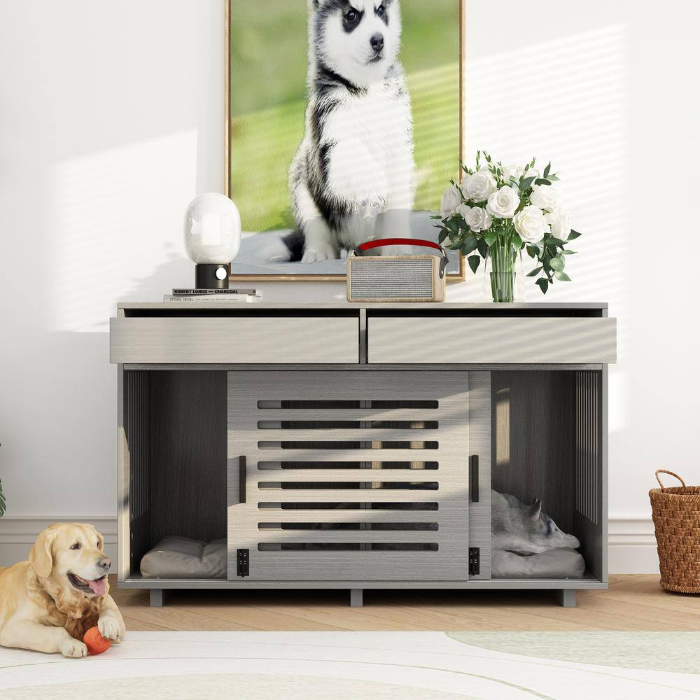 None Indoor Heavy-Duty Dog Cage, Dog House Furniture with Cushion Large Wooden Dog Kennel for Large Medium Small Dogs in Gray