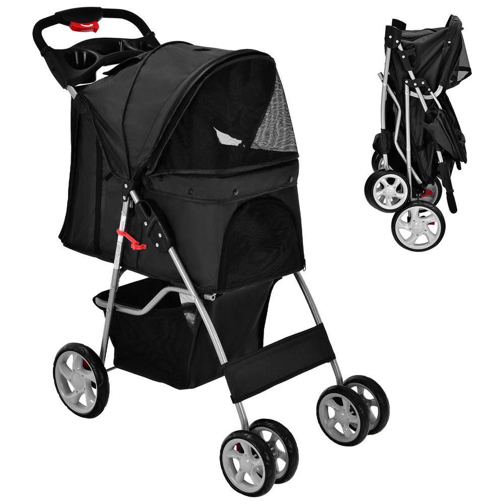 WELLFOR Foldable Pet Carrier 4-Wheel Pet Stroller in Black with Adjustable Canopy and Storage Basket