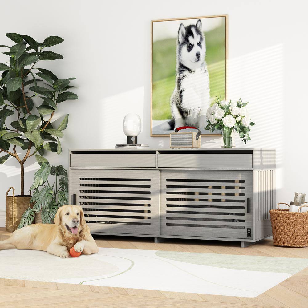 FUFU&GAGA Gray Dog Cage Furniture, Wooden Dog Crate Kennel with 2 Drawers and Divider, Heavy Duty Dog Crate for Small Medium Dogs