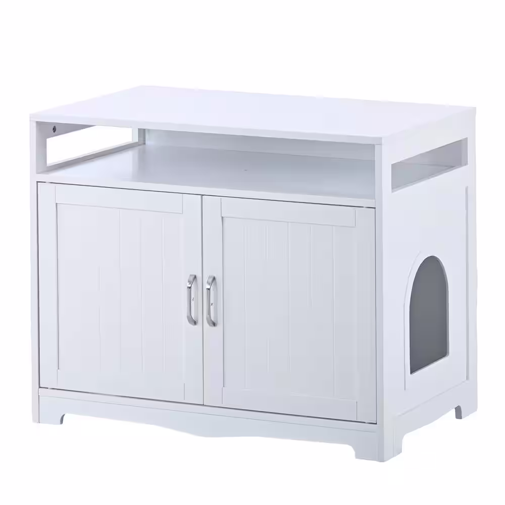 None Litter Box Enclosure Cat Litter Box Furniture with Hidden Plug 2 Doors Cat Washroom Storage in White