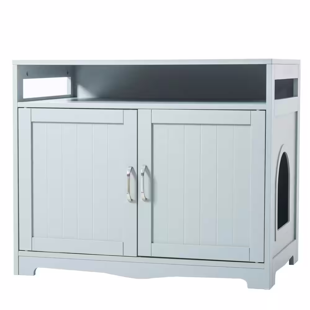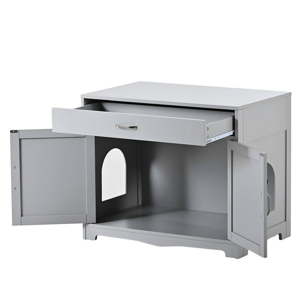 None Litter Box Enclosure Cat Litter Box Furniture with Hidden Plug 2 Doors Cat Washroom Storage Bench Side Table in Gray