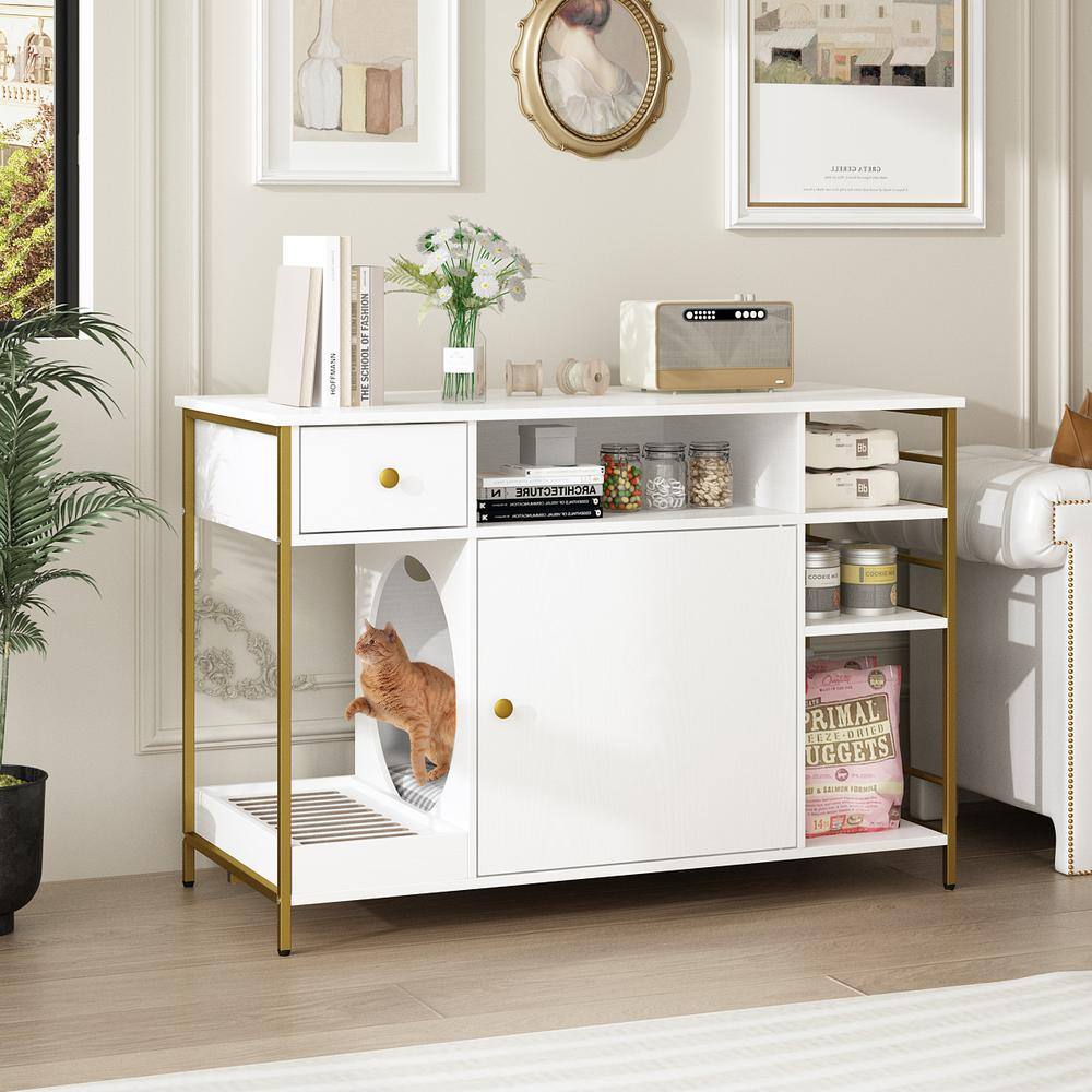 None 6 in 1 White Cat Hidden Litter Box with Drawer and Shelves, Wood Cat Litter Box Enclosure Furniture with Litter Catcher
