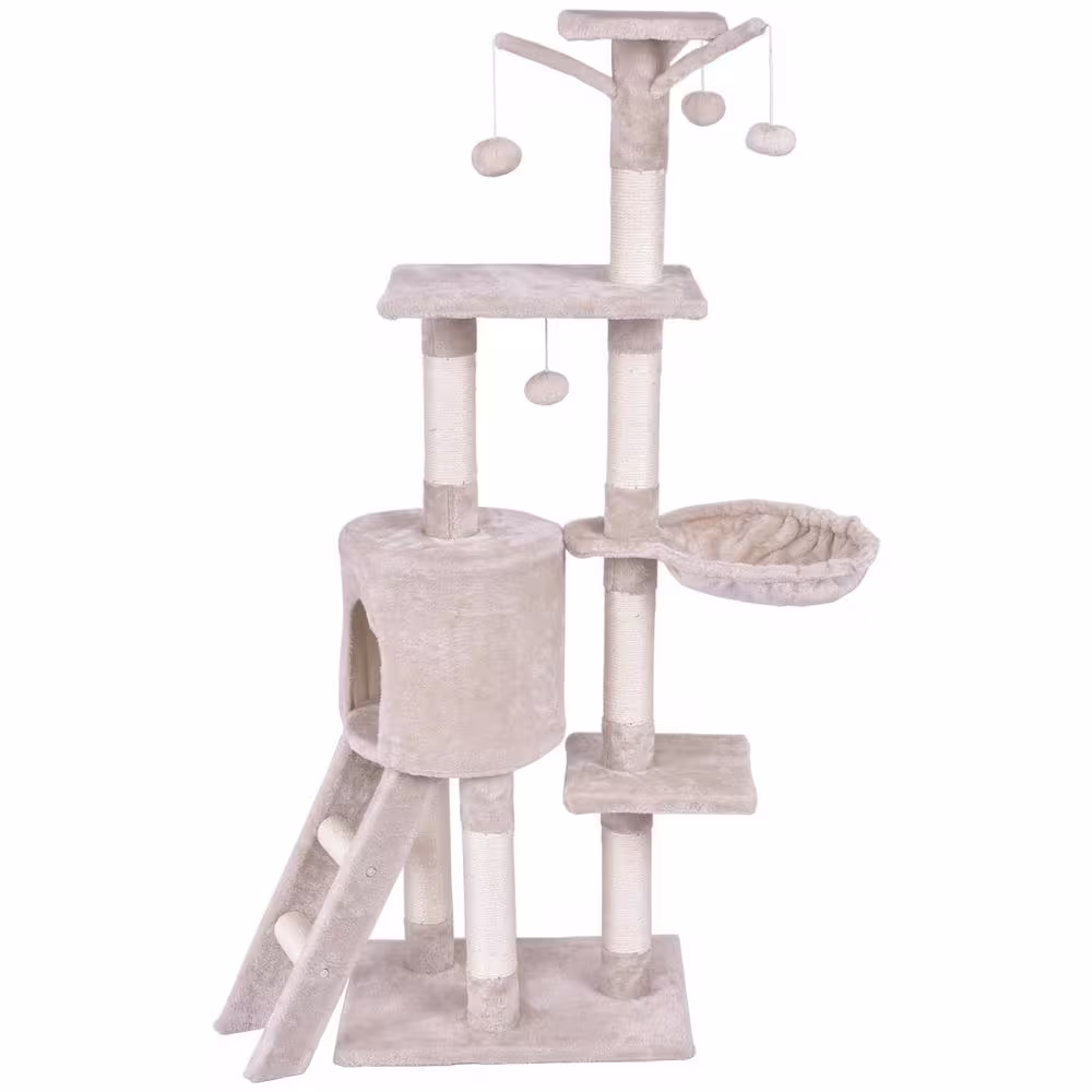 WELLFOR Beige Cat Trees and Scratch Posts Furniture Cover Kitten Climbing Tower Cat Condo with Sisal-Covered Posts and Ladder
