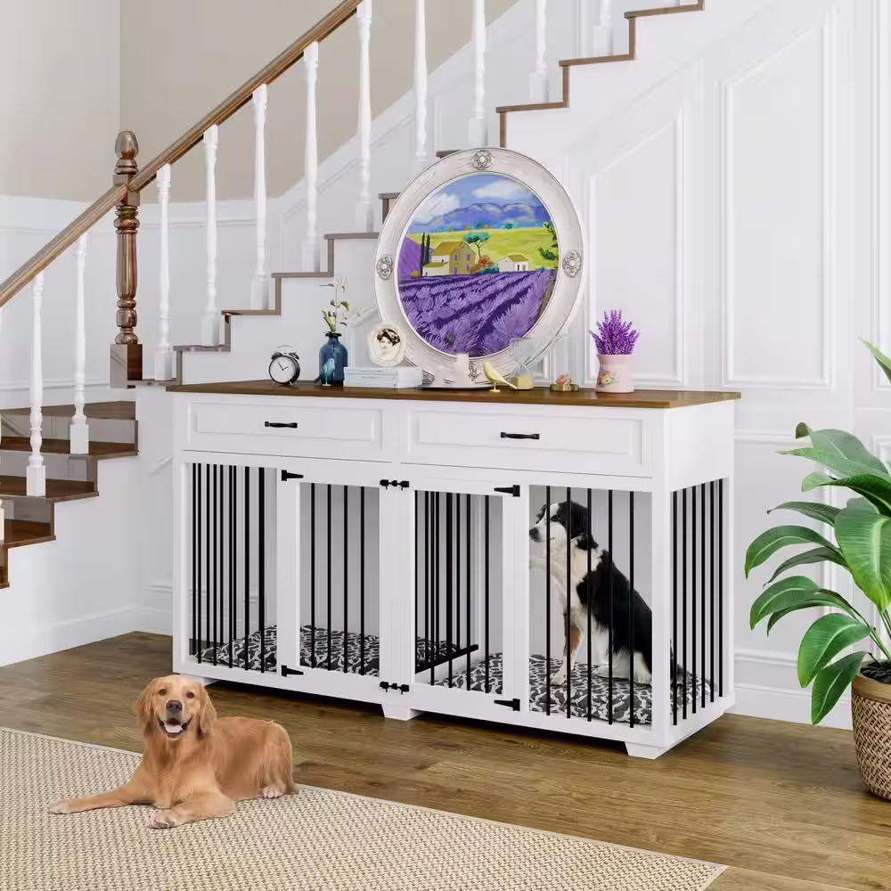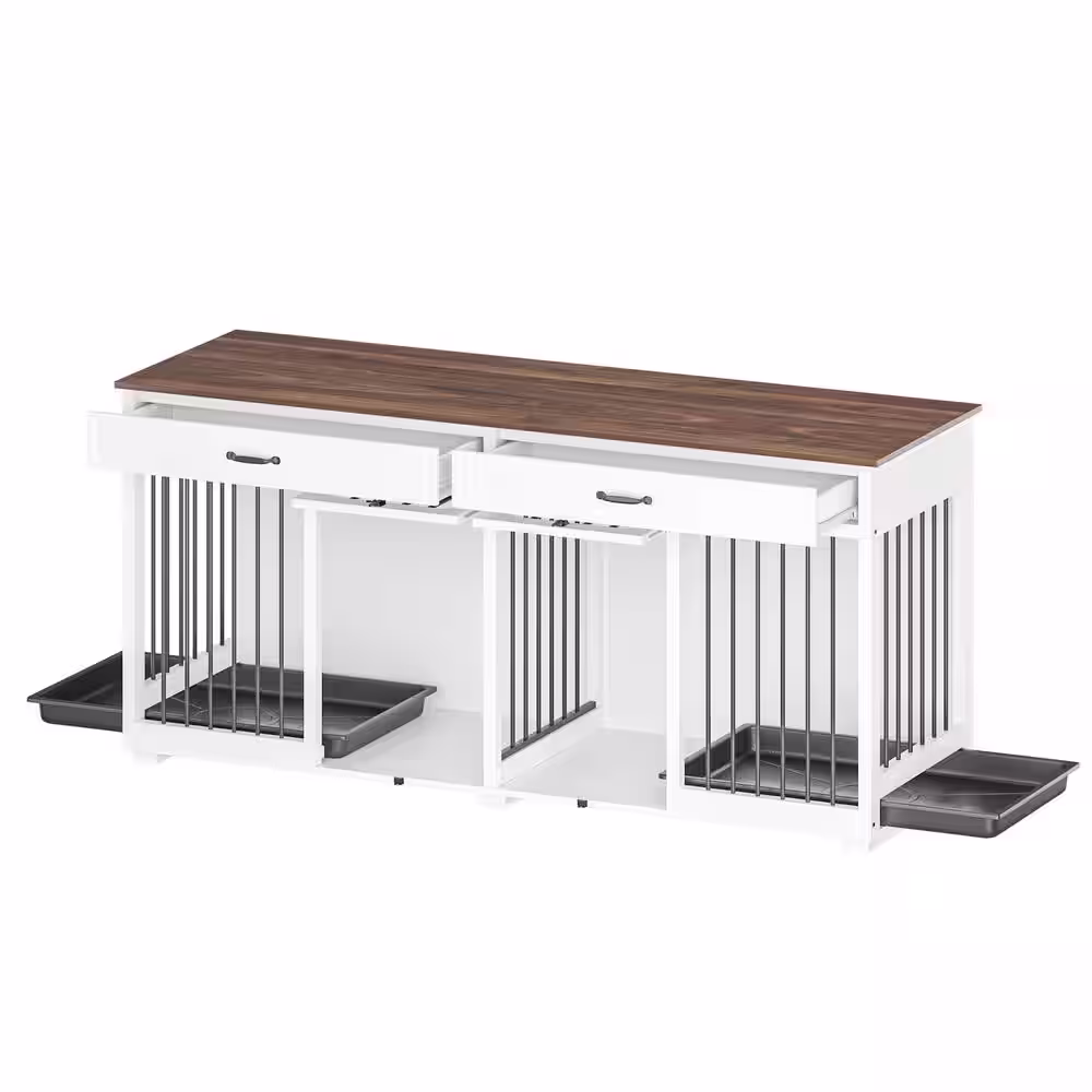 FUFU&GAGA Indoor Large Furniture Style Dog House Kennel with 2 Drawers, Large Dog Crate Cage with Trays for 2 Medium Dogs, White