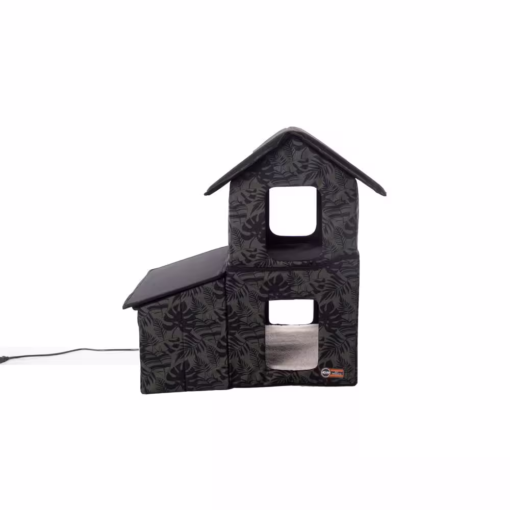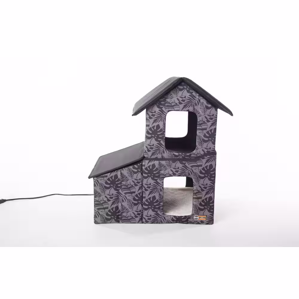 K and H Pet Products Outdoor Heated 2-Story Kitty House with Dining Room Gray Leaf Print Medium