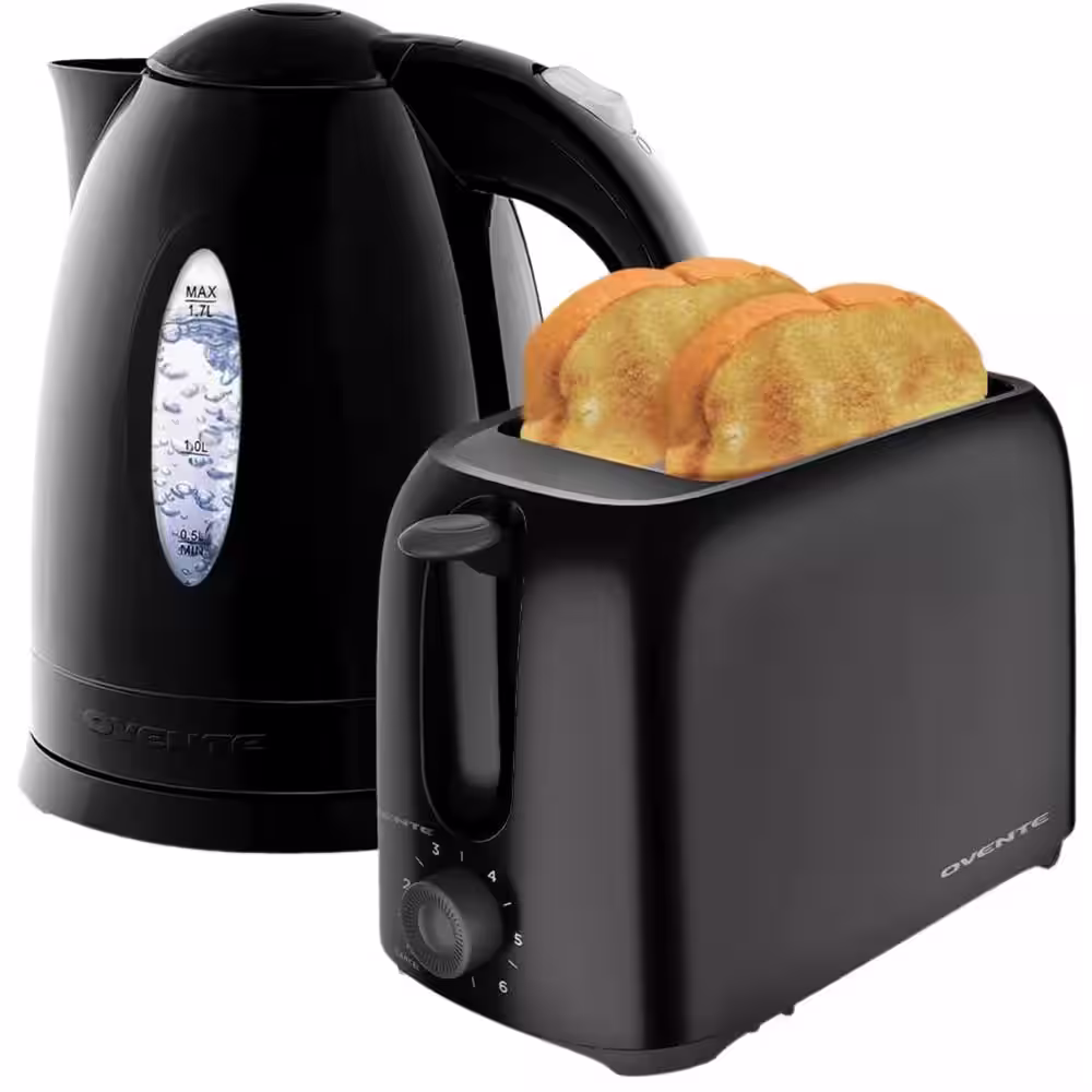 OVENTE 7-Cup Black Cordless Body Electric Kettle with 2-Slice Black Bread Toaster
