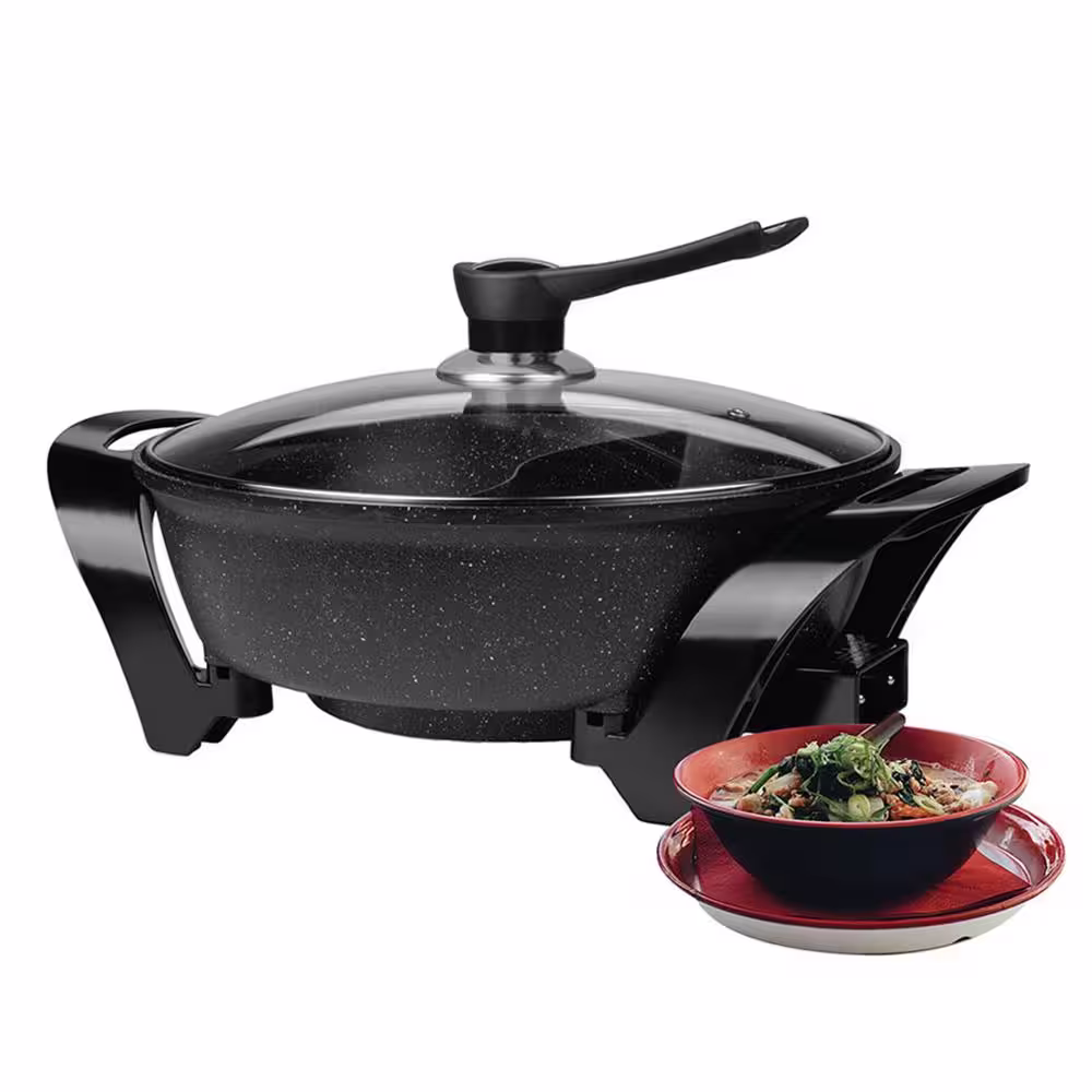 Brentwood 6 Qt. Black Electric Shabu Shabu Pot with Divider