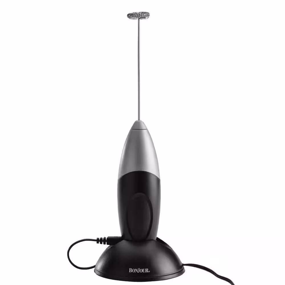 BonJour Battery-Powered Black Stainless Steel Milk Frother with Chrome Stand