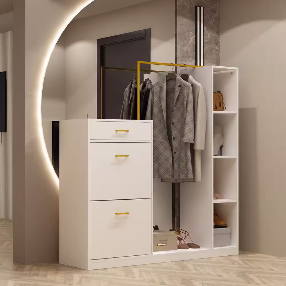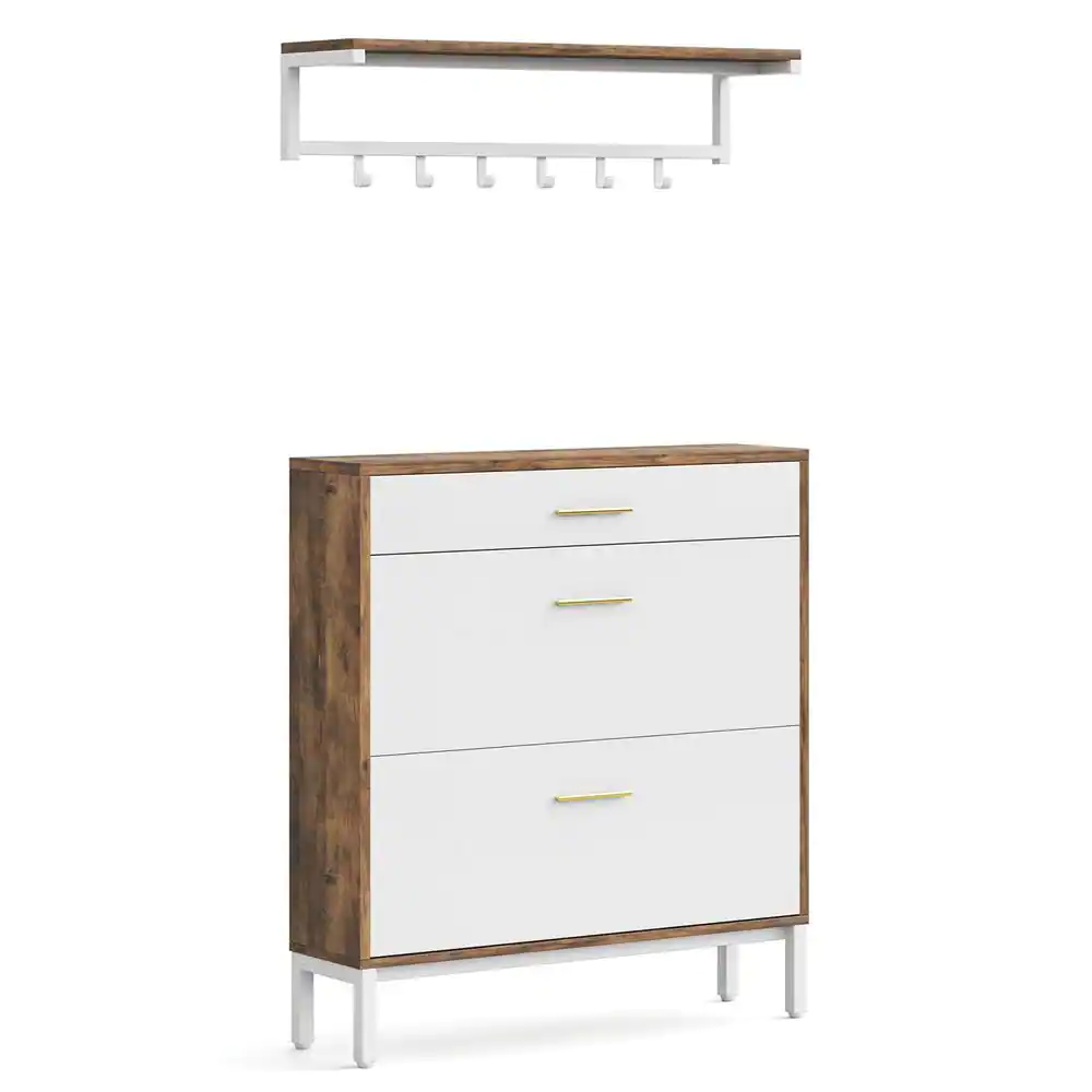 TRIBESIGNS WAY TO ORIGIN White and Brown Shoe Storage Cabinet with Drawer, Flip Shelves and Wall Mount Rack