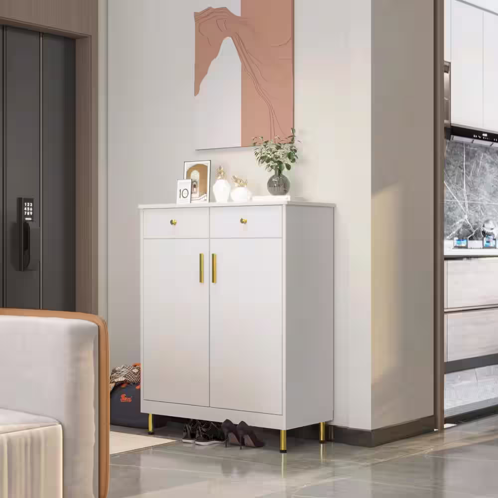 None White Wooden Shoes Storage Cabinet with Adjustable Shelves and 2 Drawers, 31.5 in. W Ã 39.4 in. H