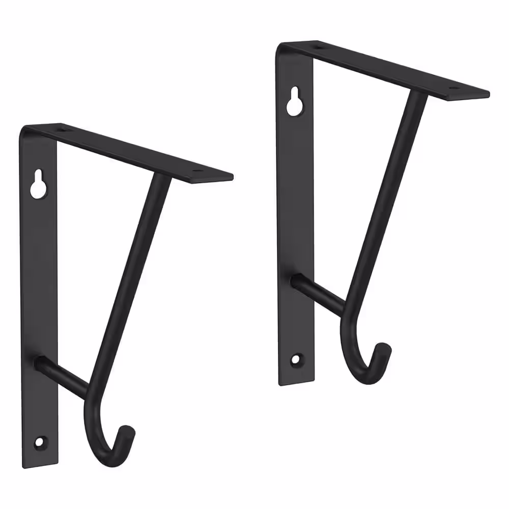 Liberty 7 in. Matte Black Steel Decorative Shelf Bracket with Hook (2-Pack)